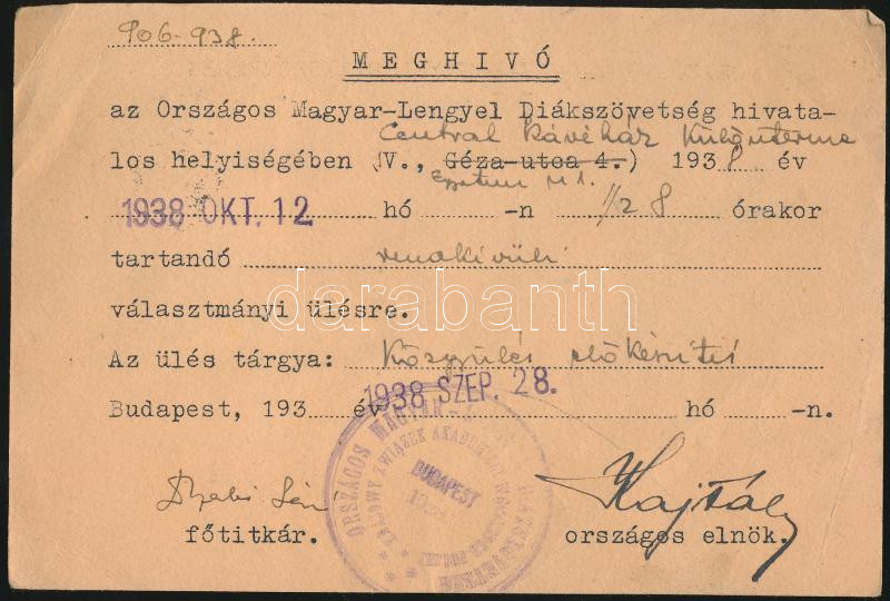 1938 Az Országos Magyar-Lengyel Diákszövetség meghívója, pecséttel, az...