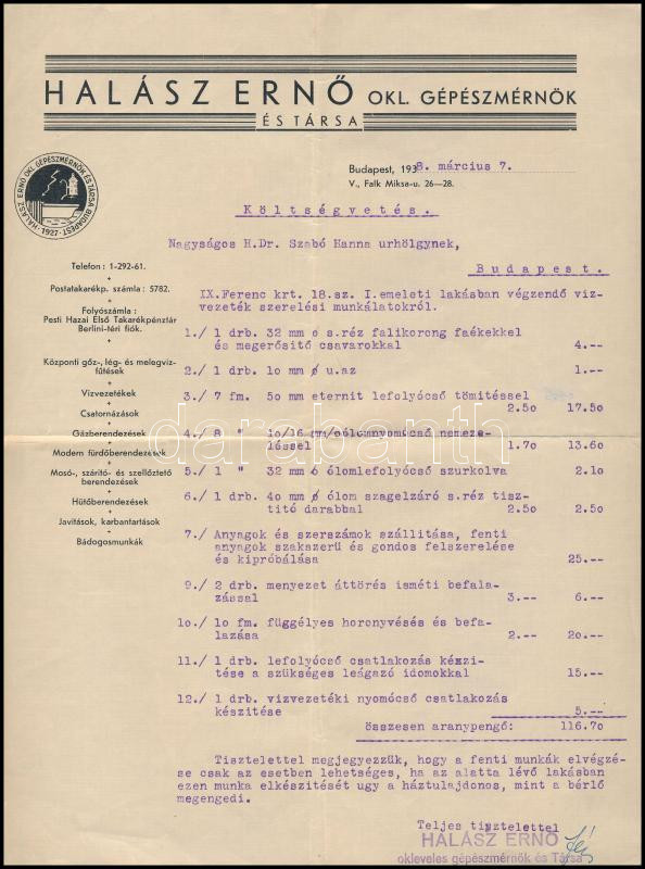 1938 Halász Ernő okl. gépészmérnök által készített költségvetés lakásf...