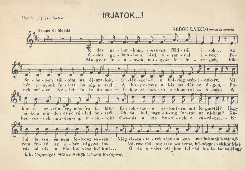 1942 Írjatok...! Sebők László katonadala szöveggel és kottával, Hajdu ...