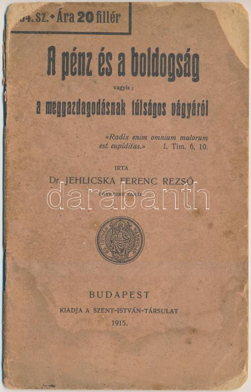 Dr. Jehlicska Ferenc Rezső: A pénz és a boldogság, vagyis a meggazdago... https://www.darabanth.com/en/262-Online-auction/262.0/Other-collectibles/Printed-Materials~20/Dr-Jehlicska-Ferenc-Rezso-A-penz-es-a-boldogsag-vagyis-a-meggazdagodasnak-tulsagos-vagya~II1258398