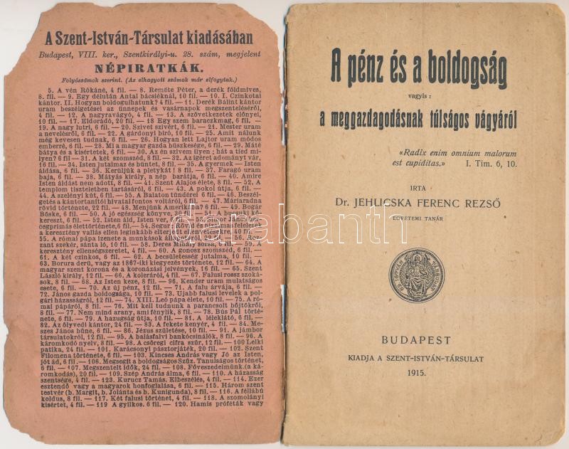 Description: Dr. Jehlicska Ferenc Rezső: A pénz és a boldogság, vagyis a meggazdagodásnak túlságos vágyáról. Bp., 1915, Szent István Társulat. 30 p. Kiadói, gerincén sérült kartonkötésben.