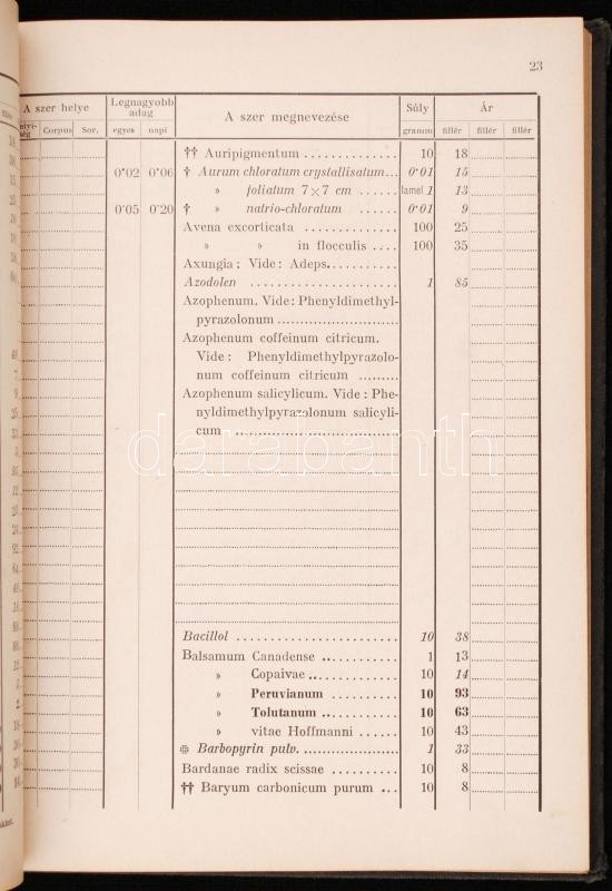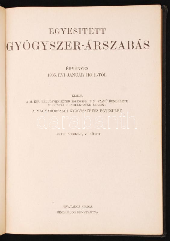 Egyesített gyógyszer-árszabás. Bp., 1935. Magyar Gyógyszerész Egyesüle...
