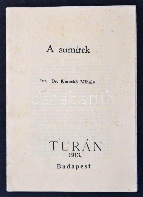 Kmoskó Mihály: A sumírek. Különlenyomat a "Turán" 1913. I. évfolyam 3-ik számából. 33 p. Kiadói tűzött papírkötésben.
