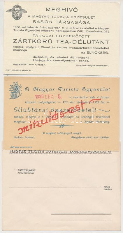 cca 1930 Magyar Turista Egylet 3 különböző meghívó levelezőlap