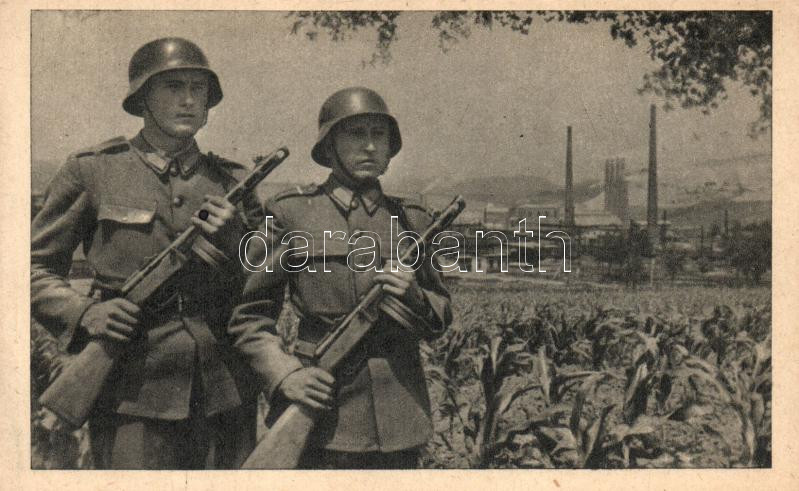 Description: 'A dolgozó nép vagyonát védik a néphadsereg katonái', szocialista-kommunista propaganda, katonák PPS géppisztollyal / 'The people's Army defends the people's property', socialist-communist propaganda, soldiers with PPSh submachine gun (EB)