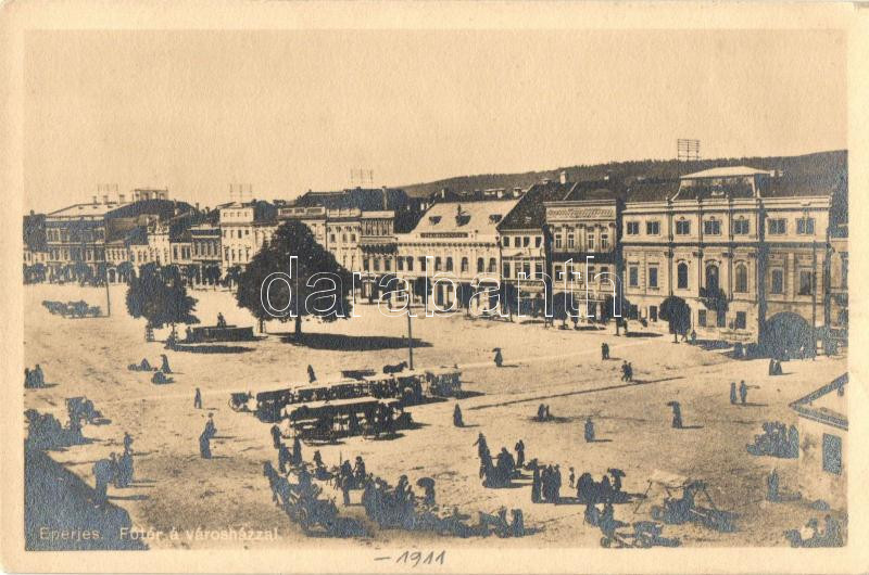 Eperjes, Presov; Főtér, városháza, piac, Tauth Viktor üzlete, Takarékp...
