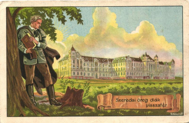 Csíkszereda, Miercurea Ciuc; 'Szeredai öregdiák visszatér', Római Katolikus főgimnázium, képeslapfüzetből / Grammar school, Hungarian irredenta, from postcard booklet, s: Gebhardt (fa)