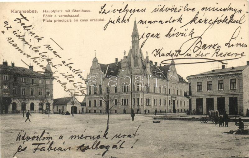Description: Karánsebes, Caransebes; Főtér a városházával, Kereskedők Egyesülete, Central kávéház, Karánsebes Takarékpénztár / main square with the town hall, Traders Association, coffe shop, savings bank (b)