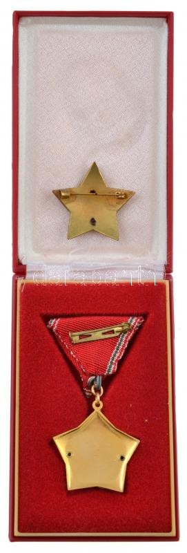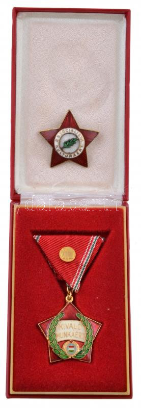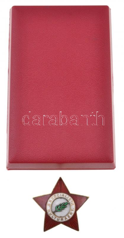 ~1970-1980. "Kiváló Munkáért" zománcozott fém kitüntetés miniatűrrel, eredeti tokban + "Szocialista kultúráért" zománcozott fém jelvény (38x38mm) T:1,2