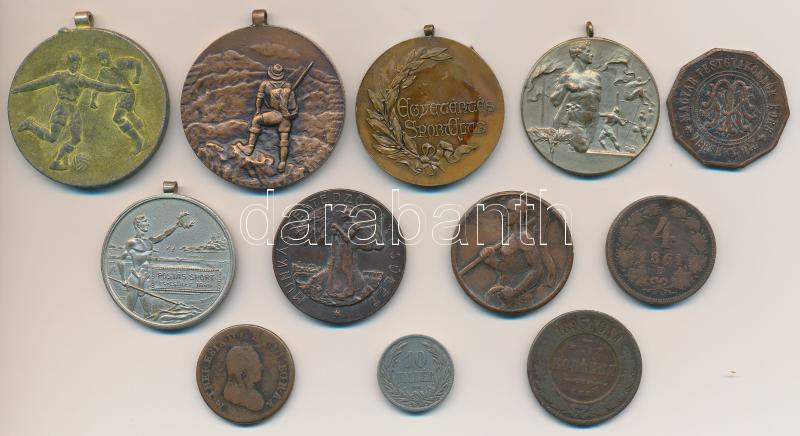 12db-os vegyes magyar és külföldi érem, emlékérem, érme tétel, közte Ripszám Henrik (1889-1976) DN "Munkás Testedző Egyesület" Br emlékérem (39mm), DN "Magyar Testgyakorlók Köre Versenydíj" Br díjérem (29x30mm), 1861B 4kr Cu T:vegyes