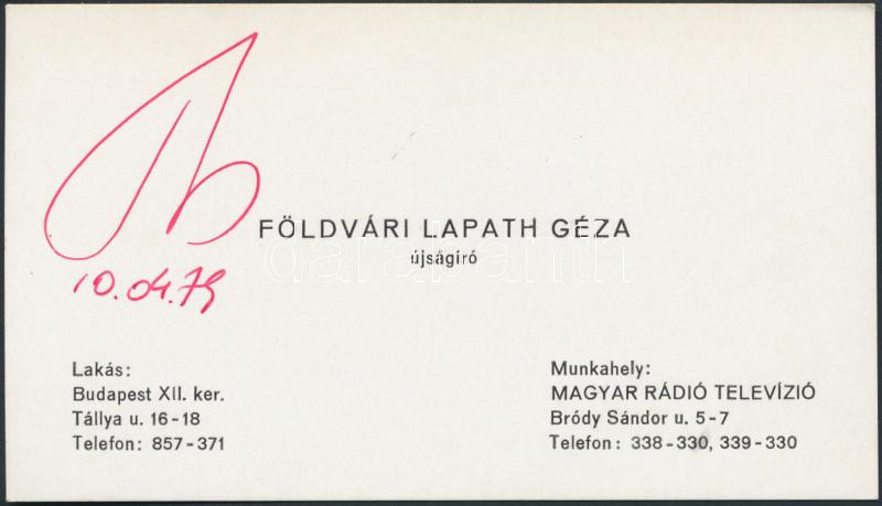 Description: 1979 Georgij Grecsko (1931- ) orosz űrhajós aláírása Földvári Lapath Géza (1939-2008) újságíró névjegykártyáján /