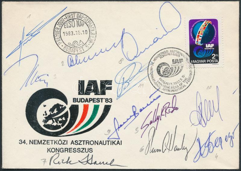 1983 11 űrhajós (Hermaszewski, Feoktyisztov, Beregovoj, Farkas Bertalan, stb.) aláírása elsőnapi emlékborítékon / 1983 Signatures of 11 astronauts (Hermaszewski, Feoktistov, Beregovoy, Bertalan Farkas, etc.) on first day envelope