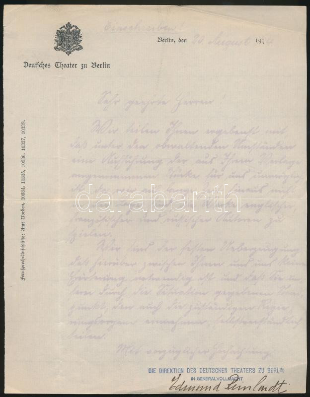 cca 1914 Berlin, A Német Színház fejléces levele Edmund Reinhardt aláí...