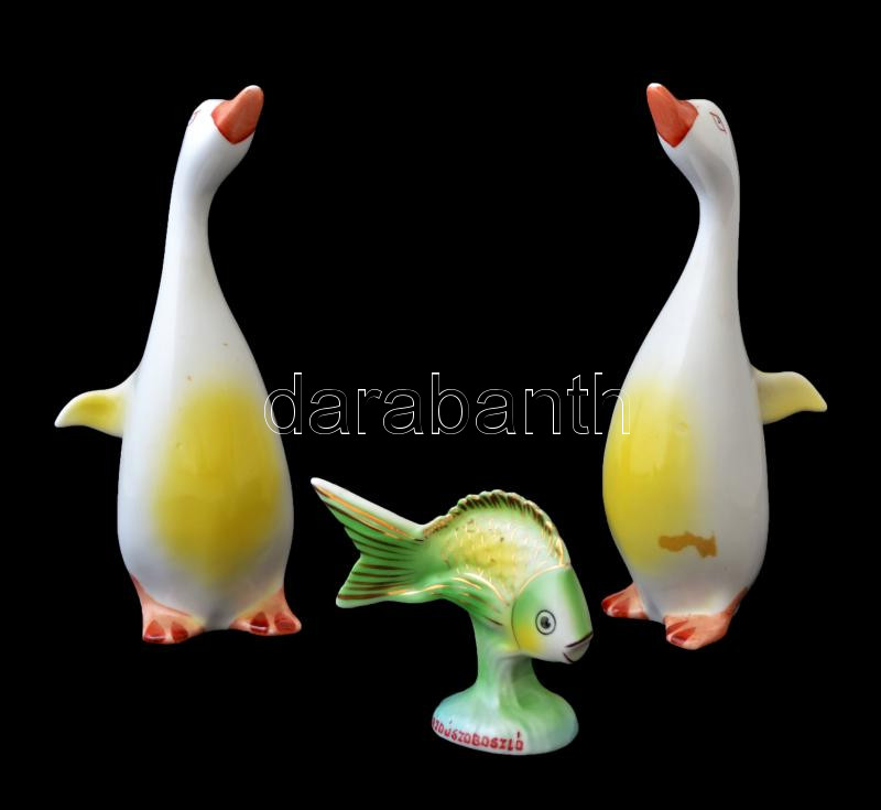 Hollóházi porcelán libák, 2 db(egyik restaurált) + Hollóházi porcelán hal, jelzettek, m: 7,5 cm