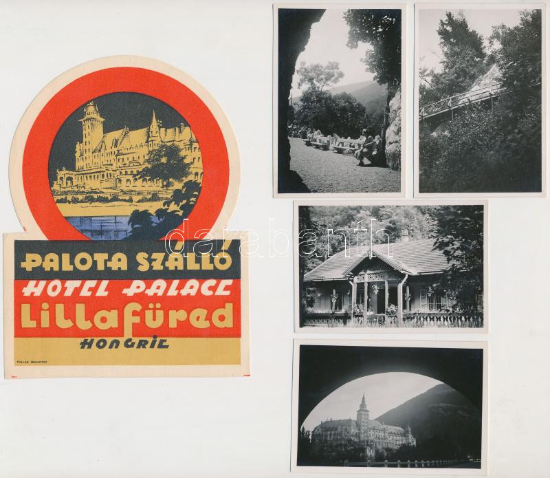1938 Lillafüred, 4 db fotó és a Palota Szálló címkéje, 9x6 cm