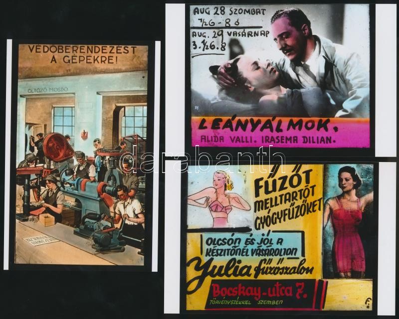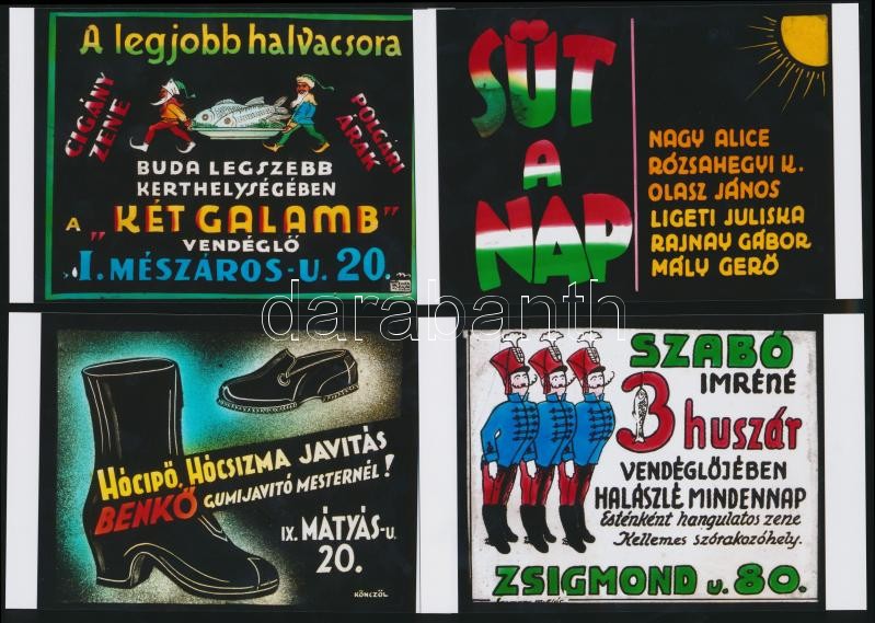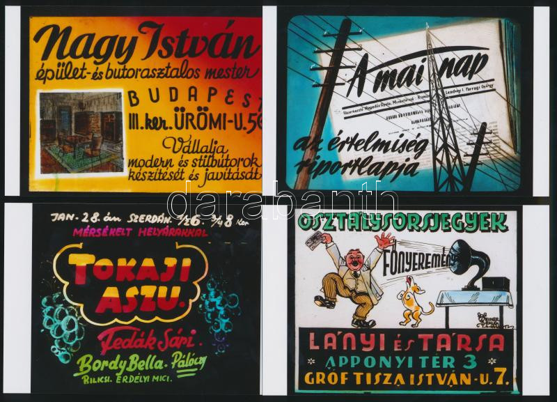 Description: cca 1946 Fekete György (1904-1990) budapesti fényképész reklámgrafikái különféle szolgáltatásokról, termékekről, ezekről készített mozikban vetíthető üveglemez diapozitív képeket, az eladásra kínált tétel 13 db papír- pozitív képet tartalmaz, melyek modern nagyítások a hagyatékában őrzött korabeli diákról 10x15 cm-es fotópapíron