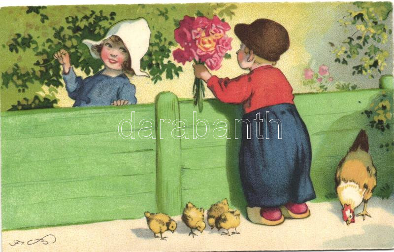 Dutch children, boy with bouquet of roses; Meissner & Buch Künstlerpostkarten No. 3084., litho s: F.B.