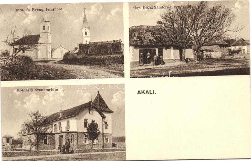 Balatonakali, Akali; Molnárfy Szanatórium, Özvegy Grósz Sándorné vendéglője, Római Katolikus és Evangélikus templom; kiadja Özvegy Grósz Sándorné
