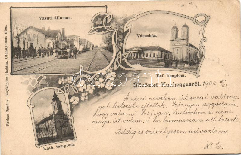 Kunhegyes, vasútállomás mozdonnyal, városház, Katolikus templom, kiadja Farkas Sándor, Art Nouveau, floral (EK)