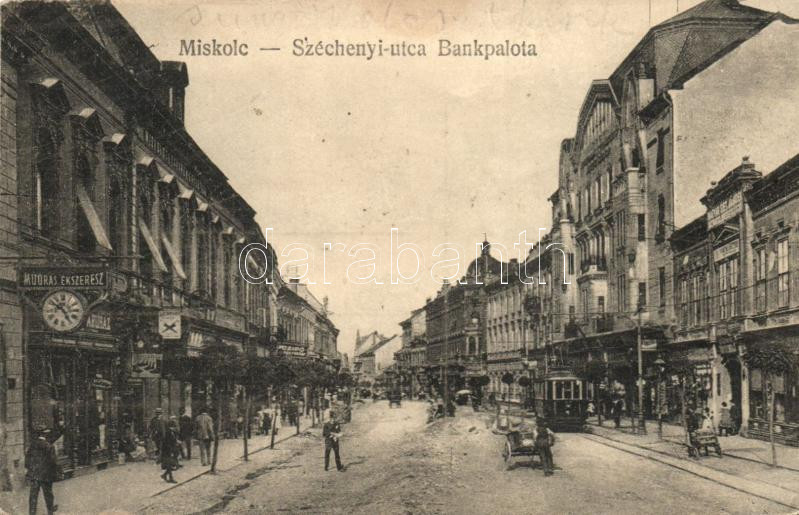 Miskolc, Széchenyi utca, Bankpalota, Műórás Ékszerész üzlet, villamos ...