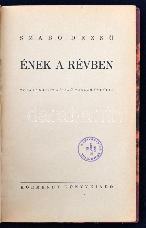 Szabó Dezső: Ének a révben. Tolnai Gábor kisérő tanulmányával. Első ki... https://www.darabanth.com/en/264-Online-auction/264.0/Books/Books-Other-rarities~40/Szabo-Dezso-Enek-a-revben-Tolnai-Gabor-kisero-tanulmanyaval-Elso-kiadas-Bp-1947-KC3~II1318307