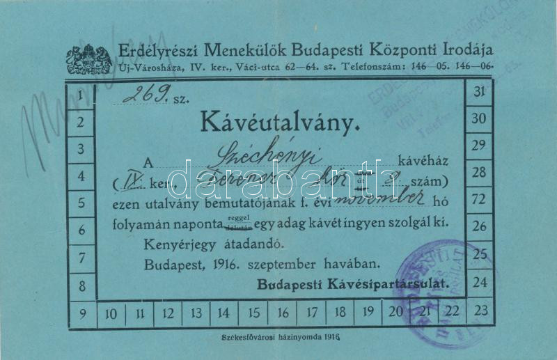 Budapest 1916. "Erdélyrészi Menekülők Budapesti Központi Irodája" kávéutalványa bélyegzésekkel T:II