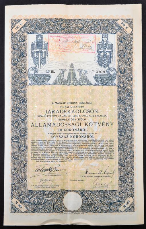 Budapest 1915. "A Magyar Korona Országai 6%-kal kamatozó járadékkölcsö... https://www.darabanth.com/en/264-Online-auction/264.0/Numismatics/Shares-and-Tickets~300004/Budapest-1915-A-Magyar-Korona-Orszagai-625-kal-kamatozo-jaradekkolcson-allamadossagi-kot~II1320078