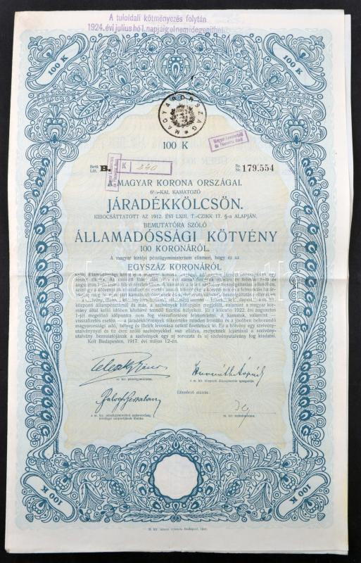 Budapest 1917. "A Magyar Korona Országai 6%-kal kamatozó Járadékkölcsön" államadóssági kötvénye 100K-ról szelvényekkel, bélyegzésekkel T:III