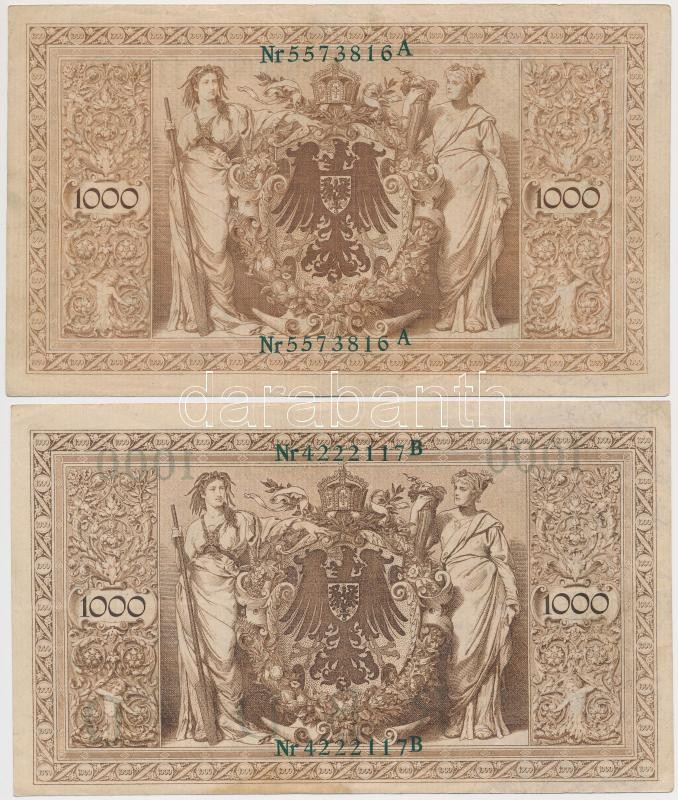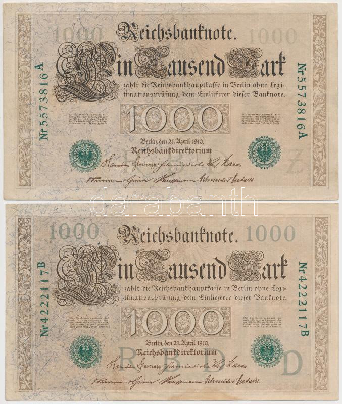 Német Birodalom 1910. 1000M hétjegyű sorszám, zöld pecséttel (2x) az e... https://www.darabanth.com/en/264-Online-auction/264.0/Numismatics/Worldwide-banknotes~300010/Nemet-Birodalom-1910-1000M-hetjegyu-sorszam-zold-pecsettel-2x-az-egyiknel-eltolodott-nyo~II1318194