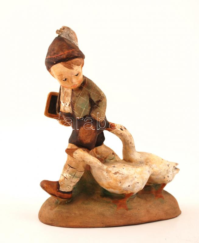 Jelzett kisfú a libákkal, festett kerámia, kopott, m:17 cm, h:13 cm