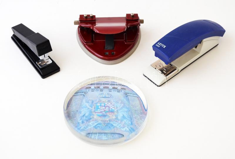 Íróasztali tétel: tűzőgép(2 db), lyukasztó, levélnehezék, összesen 4 d...