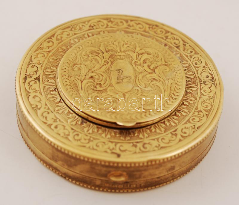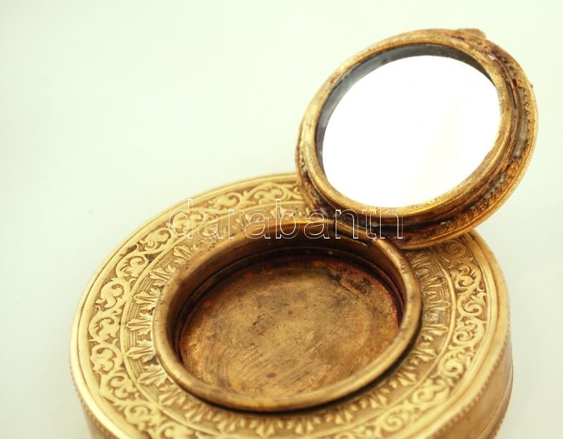 Réz púdertartó díszes ornamentikával, "Baeder" jelzéssel, tükörrel, jó állapotban, d: 6,5 cm, m: 1,5 cm