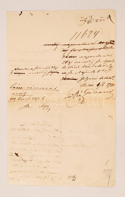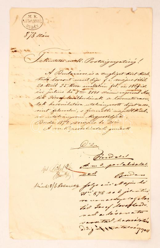 1872 A budai m.k. postahivatal levele a Postaigazgatóság részére a Budavár-Zugliget lóvasút menetdíjának változása ügyében. A hajtás mentén apró szakadással.