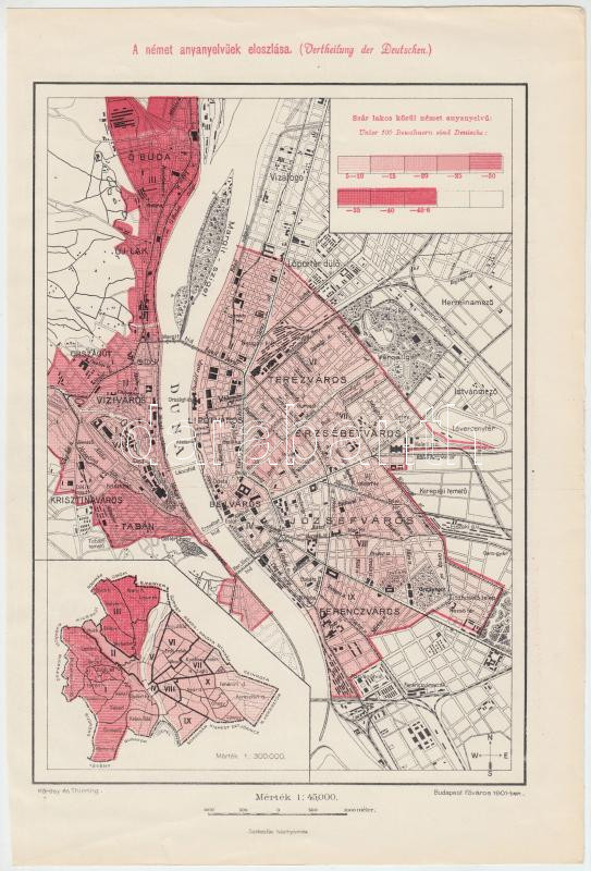 cca 1905 A magyar és német anyanyelvűek eloszlása térkép, Kőrösy és Th...