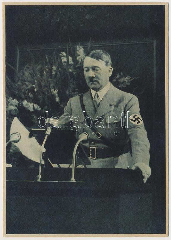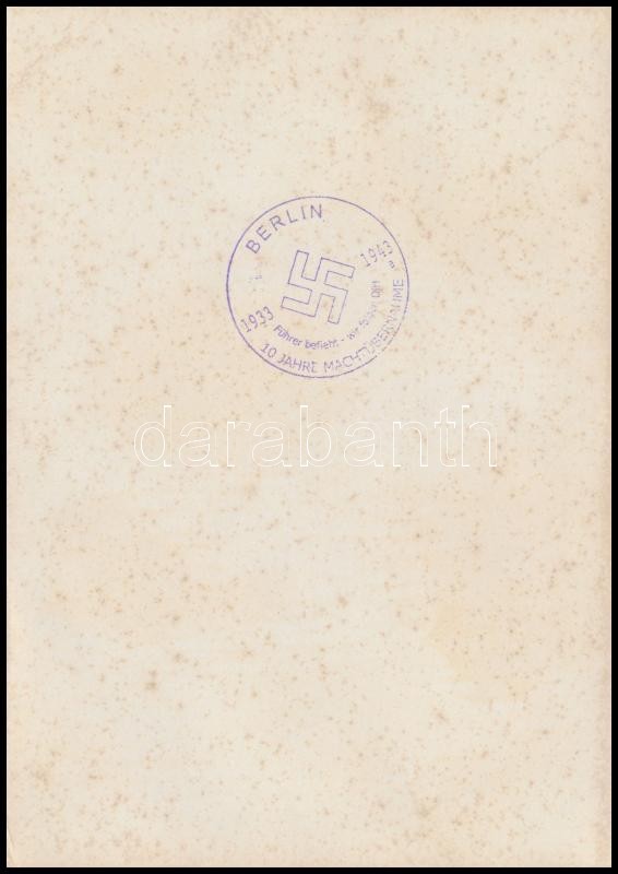 1943 Hitler,korabeli nyomtatvány, verzón horogkeresztes pecsét" Berlin, 1933-1943, Führer befieht-wir folgen dir!" felirattal,17x12cm /1943 Hitler, print, "Berlin, 1933-1943, Fuhrer befieht-wir folgen dir!" inscription, 17x12cm