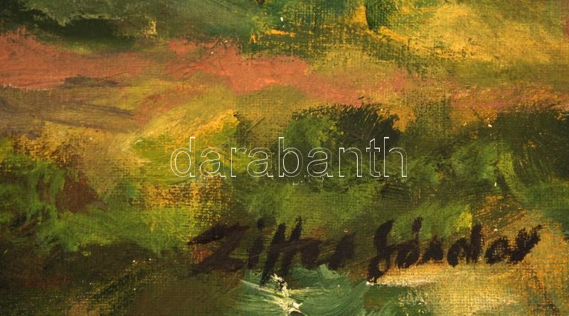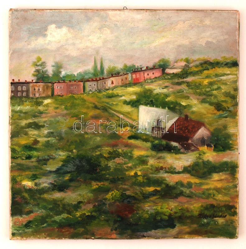 Ziffer jelzéssel: Házsor az erdő végén. Olaj, vászon, jelzett, 50x50 c...