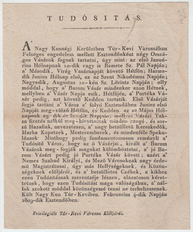 1809 'Tudósítás' Hirdetmény Túrkeve városában tartandó évi négy vásár ...