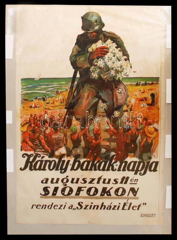 1916 Károly bakák napja Siófokon, rendezi a "Színházi Élet" nagy méretű plakát két apró szakadással egyébként jó állapotban, 94x62cm