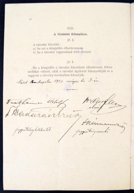 1923 A Salgó-Tarjáni Kőszénbánya Rt. Alapszabályai. Benne dr. Chorin Ferenc elnök és Wertheimer Adolf bankár hitelesítő aláírásával.