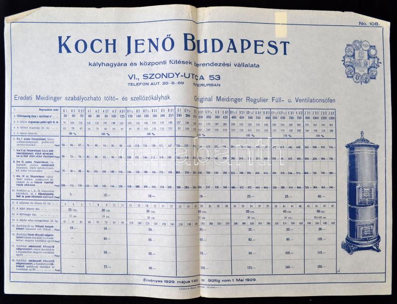 1929 Koch Jenő Budapesti kályha és központi fűtések berendezési vállalatának nagyméretű árjegyzéke, 31x48 cm