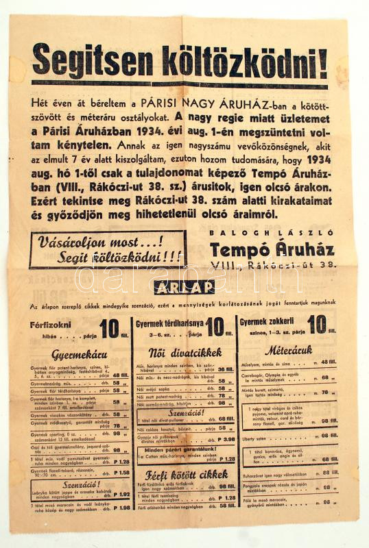 1934 Bp.VIII., A Tempó Áruház nagyméretű szórólapja, benne a költözésr...