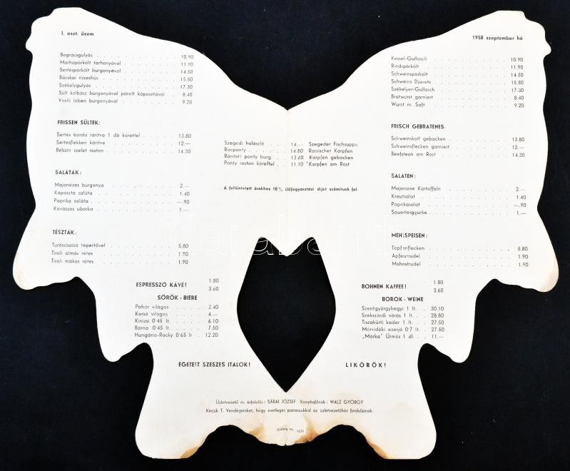 1958 A IX. kerület Szegedi Halászkert halformájú, kinyitható étlapja, ...