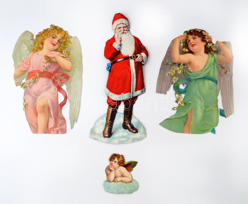 cca 1900-1920 3 db litho angyalka és 1 db litho Mikulás, gyűrődésekkel, szakadásokkal, m: 11, 32, 34 és 41 cm