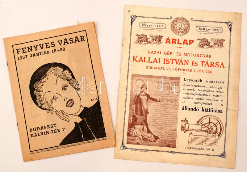 cca 1910 Kállai Hazai gép- és motorgyár fényképes katalógus, kis szakadással 8p. + 1937 Fenyves vásár katalógus. 20p.