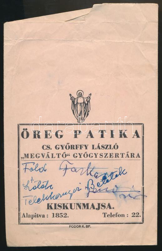 https://www.darabanth.com/en/264-Online-auction/264.0/Other-collectibles/Printed-Materials~25/cca-1920-30-Oreg-Patika-Gyorffy-Gyogyszertar-Kiskunmajsa-boritek-17x11cm~II1319878
