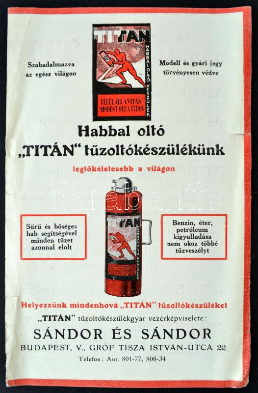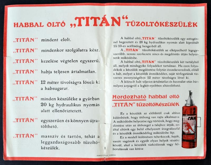 cca 1940 "Titán" habbal oltó tűzoltókészülék reklám nyomtatványa, kis ...