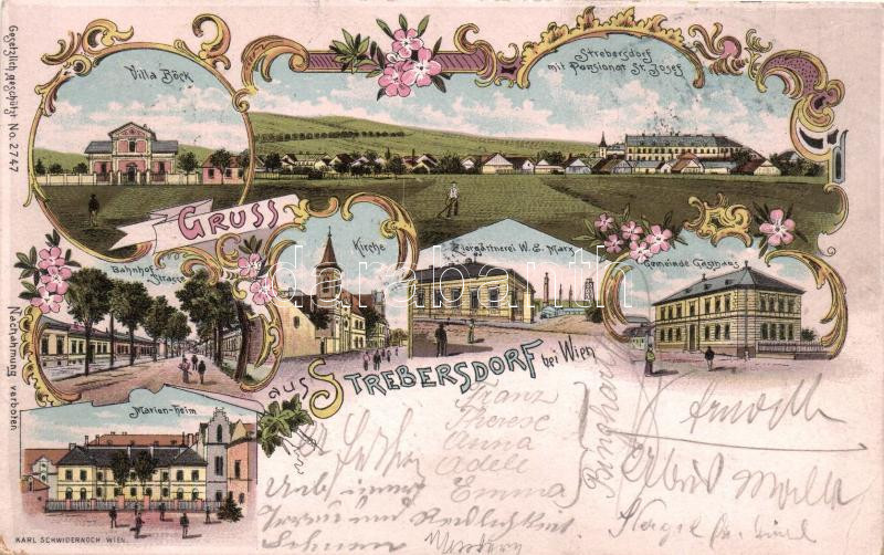 Strebersdorf bei Wien; Villa Böck, Pansionat St. Josef, Kirche, Bahnhof Strasse, Marien Heim, Gemeinde Gasthaus, Ziergärtnerei W.E. Marx / villa, pensionat, church, street, guest house, horticulture; Karl Schwidernoch floral, Art Nouveau litho (EK)