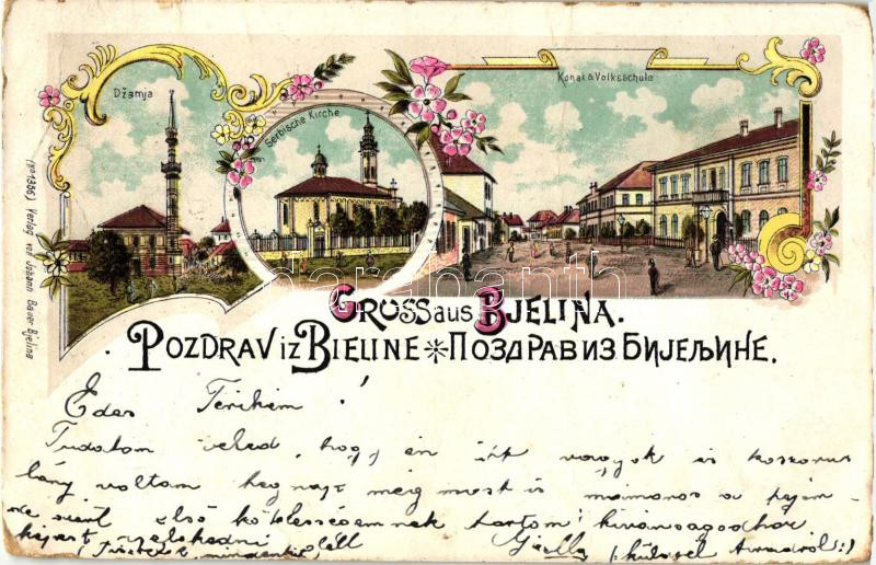 1899 Bjelina, Bieline; Dzamja, Serbische Kirche, Konak & Volksschule / mosque, Serbian church, school, floral, Art Nouvea litho; Verlag von Johann Bauer (fa)