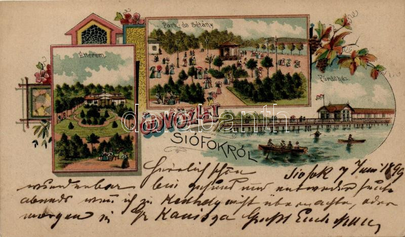 1899 Siófok, Park és sétány, étterem, fürdőház, floral, Art Nouveau litho (EK)