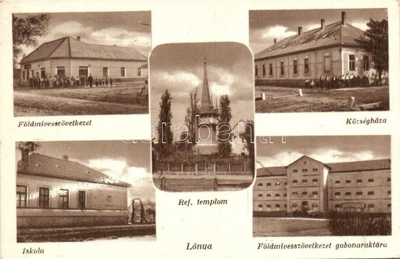 Lónya, Földmívesszövetkezet, a szövetkezet gabonaraktára, községháza, iskola, Református templom